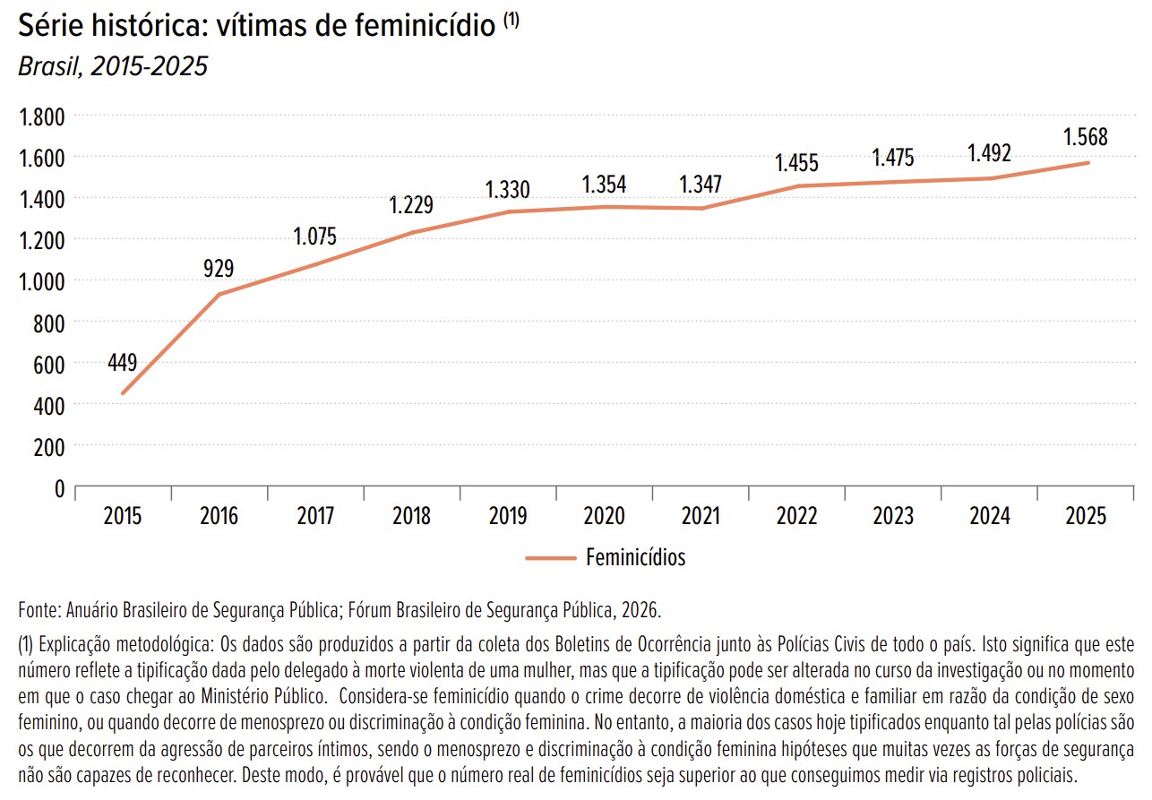 Enquanto levantamentos trazem uma queda significativa na violência letal no Brasil, ano após ano, outros dados revelam uma ferida aberta que se recusa a fechar e que deveria nos tirar o sono. O contraste entre o Atlas da Violência e os recentes relatórios de feminicídio expõe uma realidade brutal: entre 2015 e 2025, o número total de mortes violentas no país caiu drasticamente de 59.080 para 34.086 — uma redução real de 43%. No entanto, no mesmo período, os feminicídios registrados saltaram de 449 para 1.568 casos, de acordo com o FBSP (Forum Brasileiro de Segurança Pública).